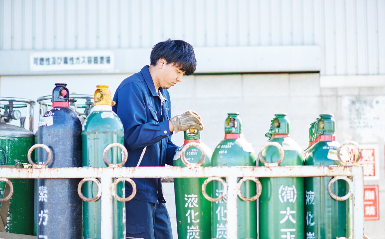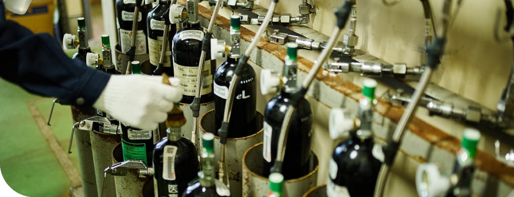 酸素・窒素・アルゴンなどの空気分離ガスをはじめ、炭酸ガス、水素、ヘリウム、医療用ガスなど、さまざまなガスを取り扱っています。取り扱いや使用方法に適切な処理が必要なものもありますが、お客様には安心してお使いいただけるよう、丁寧にアフターメンテナンスを行わせていただいております。